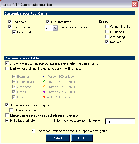 DO NOT CHECK call shots, CHECK bonus pocket and bonus balls,